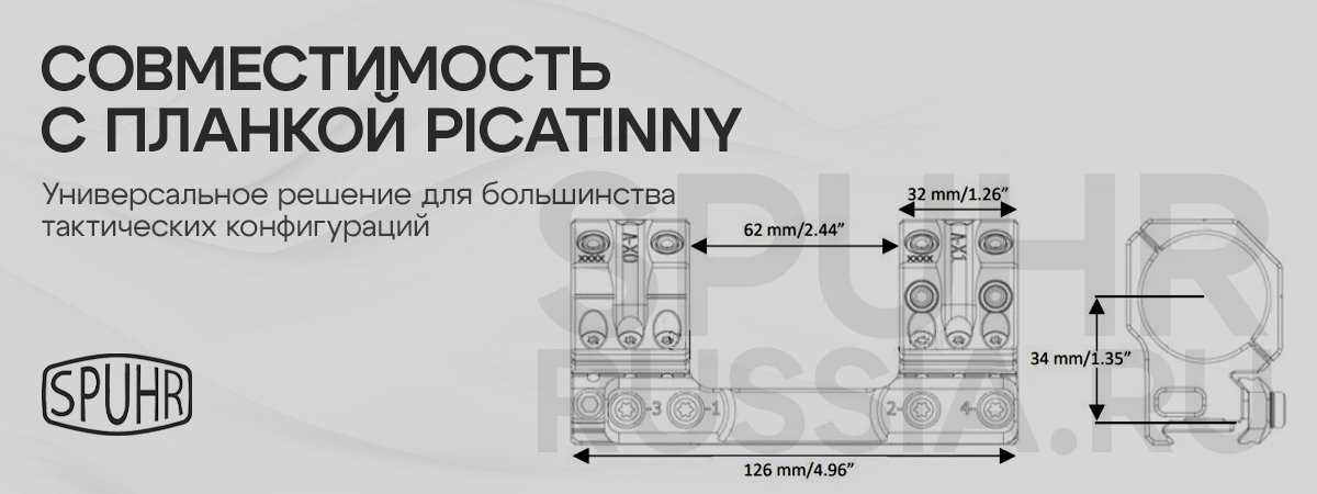 Производитель гарантирует качество любого крепления от Spuhr, а так же стабильное удержание СТП при их использовании. Возможна установка различных аксессуаров с системой "ISMS" (Ideal Scope Mount System - в буквальном переводе "идеальная система крепления оптики").