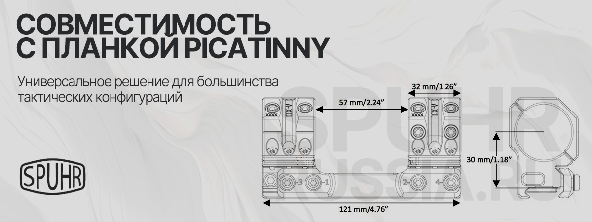 Spuhr гарантирует надёжное крепление и стабильное удержание оптического прицела. Система монтажа совместима с аксессуарами ISMS (Ideal Scope Mount System).